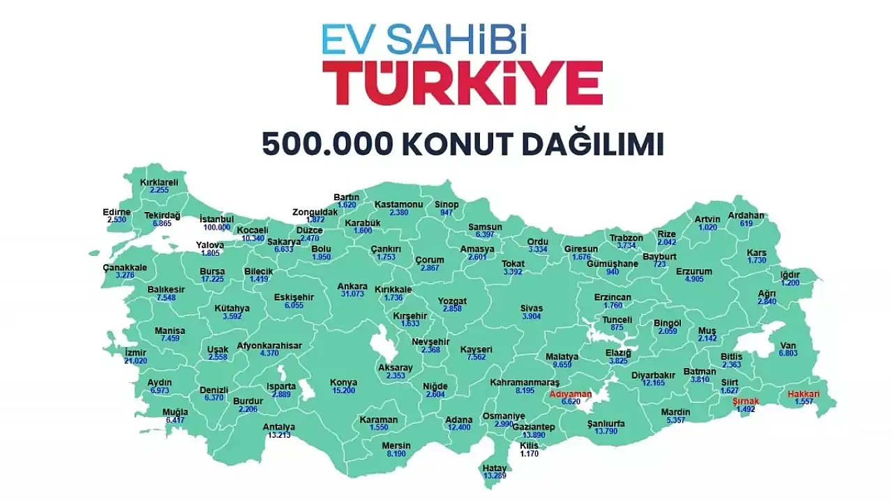 500 bin sosyal konut projesinde deprem bölgesindeki illere öncelik verilirken, konut sayıları da şu şekilde belirlendi:İl Konut Sayısı İl Konut Sayısı Gaziantep 13.890 Adana 12.400 Şanlıurfa 13.690 Diyarbakır 12.165 Hatay 13.289 Malatya 9.609 Kahramanmaraş 8.195 Adıyaman 6.620 Elazığ 3.825 Osmaniye 2.990