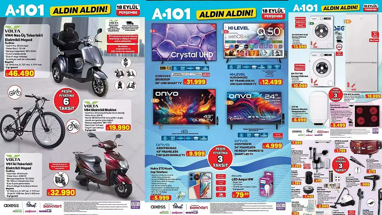 A101'in 18 Eylül Perşembe günü raflara sunacağı 'Aldın Aldın' aktüel kataloğu yayınlandı. Bu hafta teknolojik ürünlerden ev eşyalarına, mutfak gereçlerinden kamp malzemelerine kadar birçok farklı ürün yer alıyor.