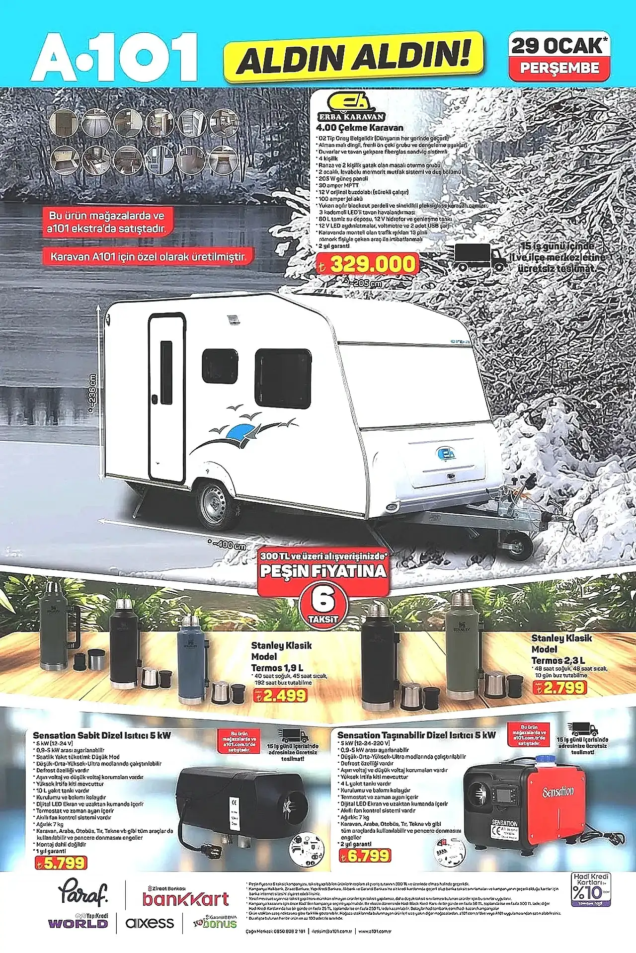 A101 market, Ocak ayındaki indirimlerine aralıksız bir şekilde devam ediyor. 29 Ocak 2026 Perşembe günü için geçerli olacak olan aktüel ürünler kataloğu yayınlandı. Yeni katalogda öne çıkan ürünlerden biri, çekme karavan. Uygun fiyat anlayışıyla geniş bir müşteri kitlesine ulaşmayı hedefleyen A101, bu sefer kamp ve karavan meraklılarını mutlu edecek bir ürünü raflarına ekliyor.