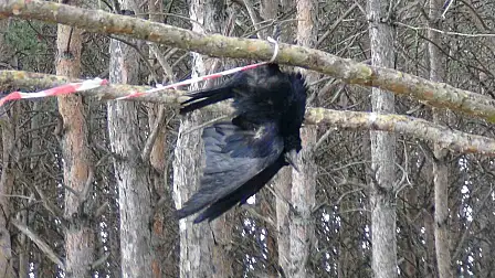 Hayvan otlatan vatandaşlar tarafından cep telefonu kamerasıyla kaydedilen görüntülerde, ağaçta ayaklarından asılı olarak telef olan karga yer alıyor.