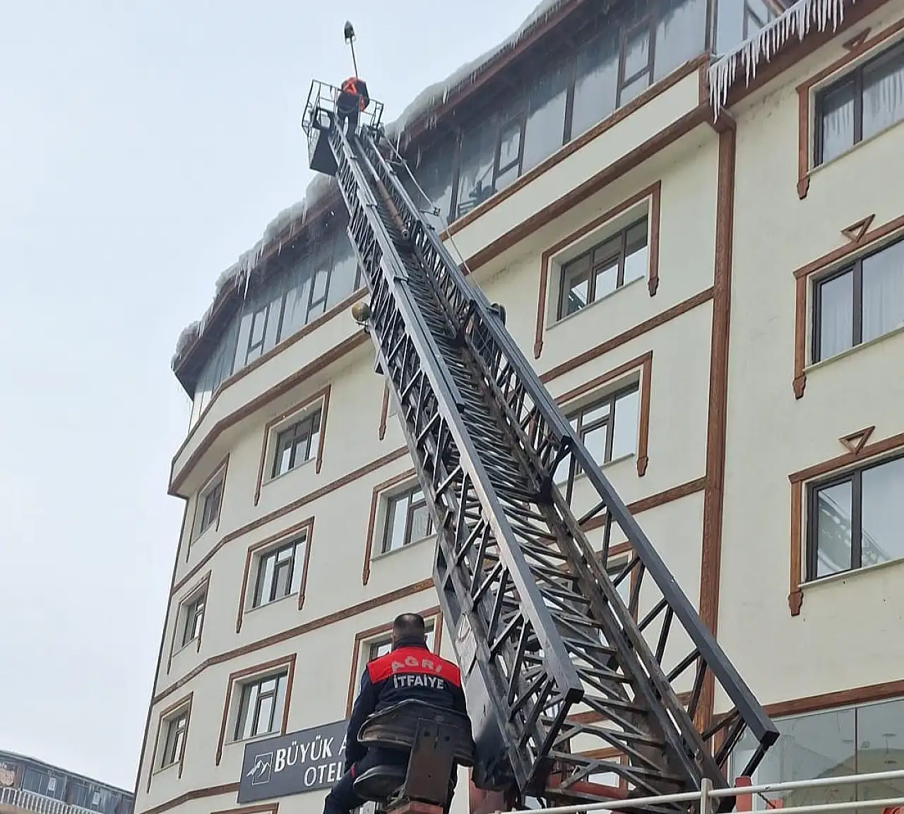 Ağrı’da kış şartlarının etkisini artırmasıyla birlikte bina saçaklarında oluşan buz sarkıtları, vatandaşlar için risk oluşturmaya başladı. Bu kapsamda Ağrı Belediyesi ekipleri, kent genelinde önlem amaçlı çalışma başlattı. Ağrı Belediyesi İtfaiye Müdürlüğü ekipleri tarafından yürütülen çalışmalarda, özellikle yaya yoğunluğunun fazla olduğu cadde ve sokaklarda bina saçaklarında oluşan buz sarkıtlarına müdahale edildi. Soğuk hava koşulları nedeniyle uzayan ve düşme riski taşıyan buzlar, ekiplerin kontrollü kırma çalışmasıyla temizlendi.