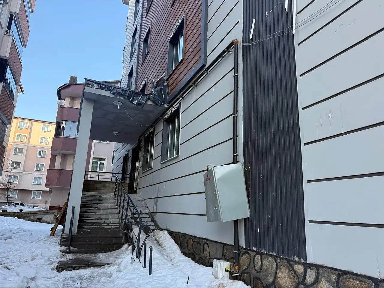 Ağrı'da ısınan hava çatılardaki karları eritti, düşen buz kütleleri apartman girişine zarar verdi.
