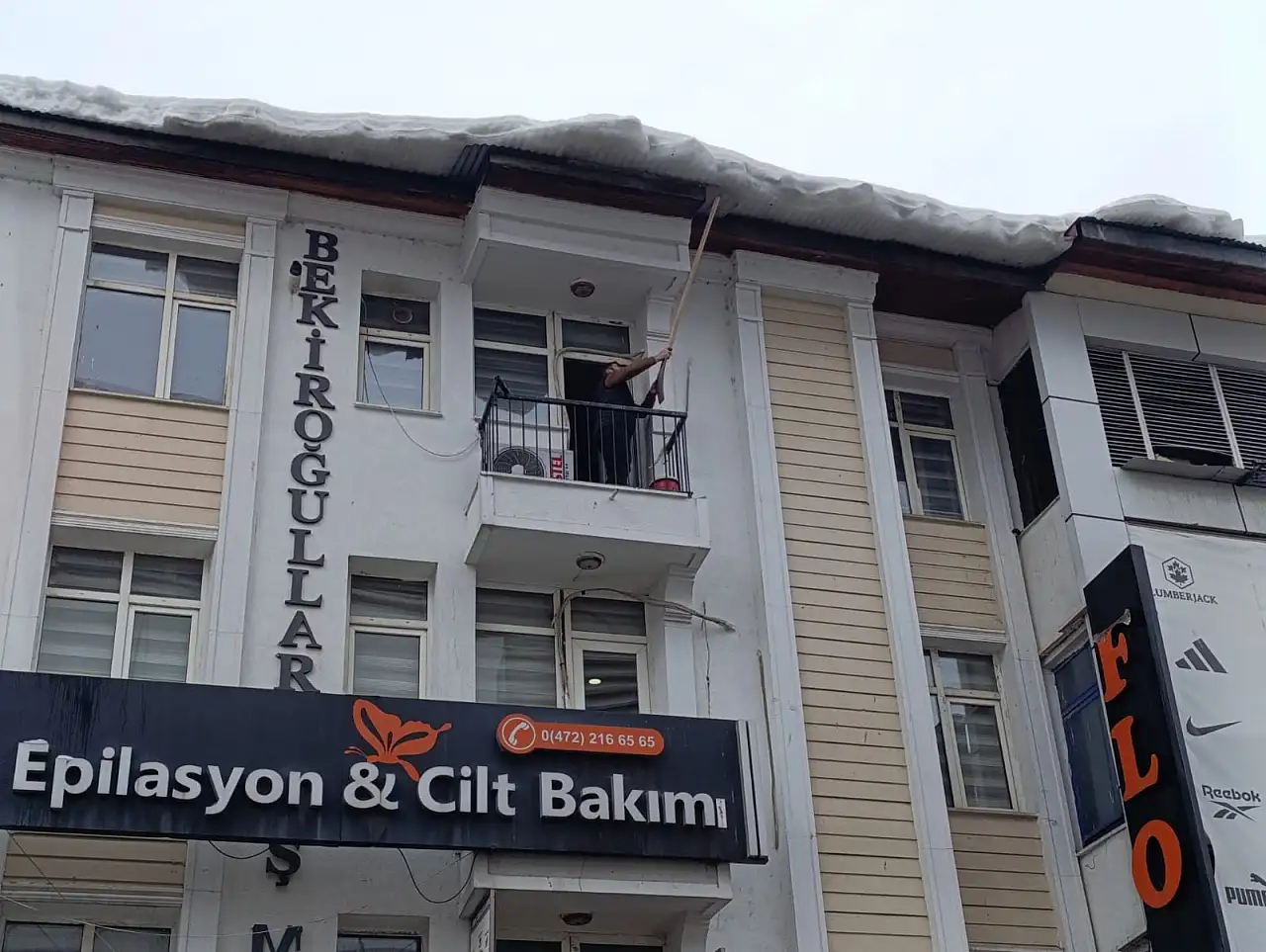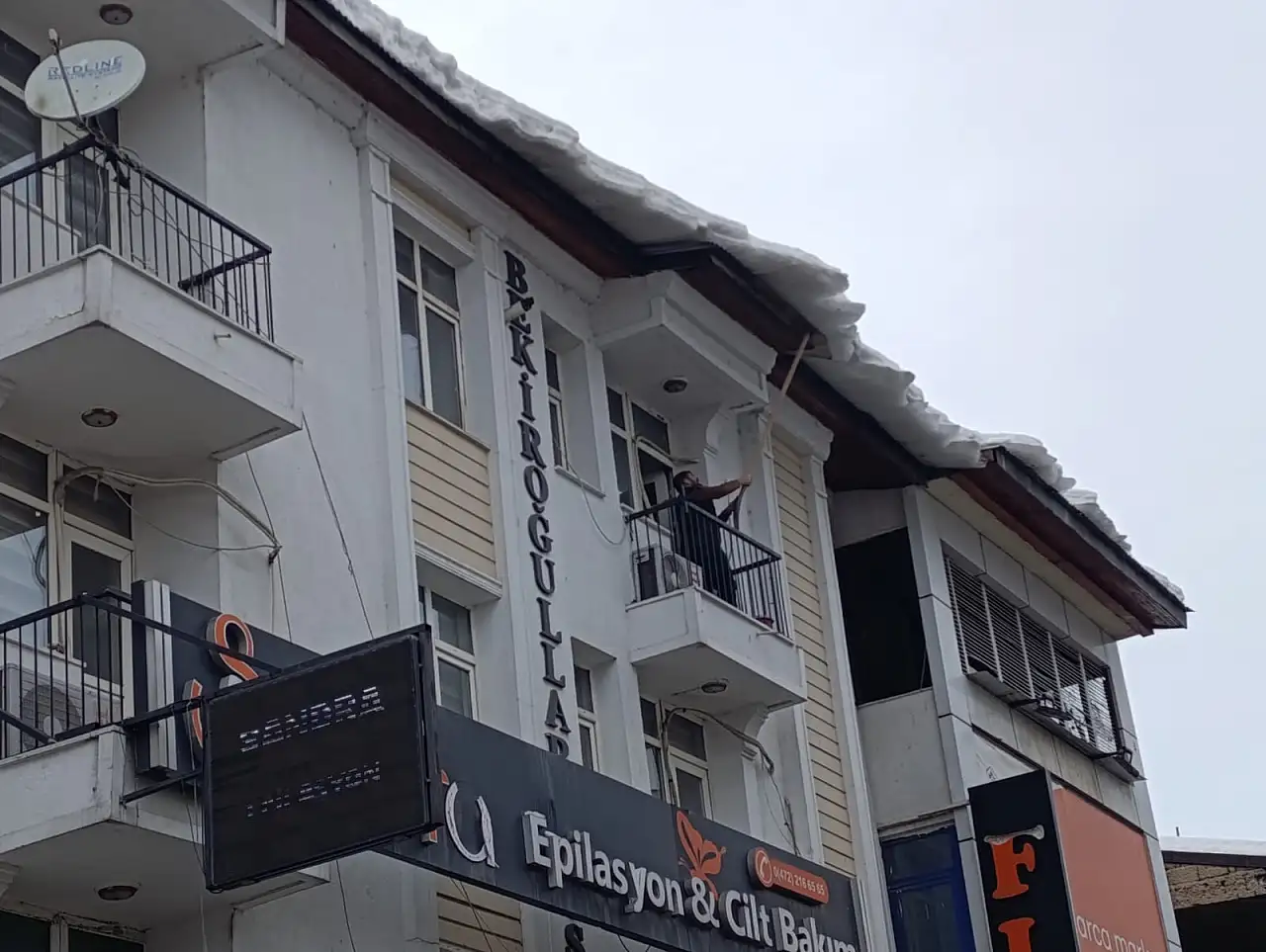 Kent merkezinin en işlek noktalarından biri olan Cumhuriyet Caddesi’nde, iş yerlerinin çatı kenarlarında biriken ve zamanla buz kütlesine dönüşen kar parçaları kontrollü şekilde aşağı indirildi. Olası düşmelere karşı önlem almak isteyen esnaf ve bina sakinleri, çatı üzerinde oluşan kar ve buz birikintilerini kırarak temizledi.