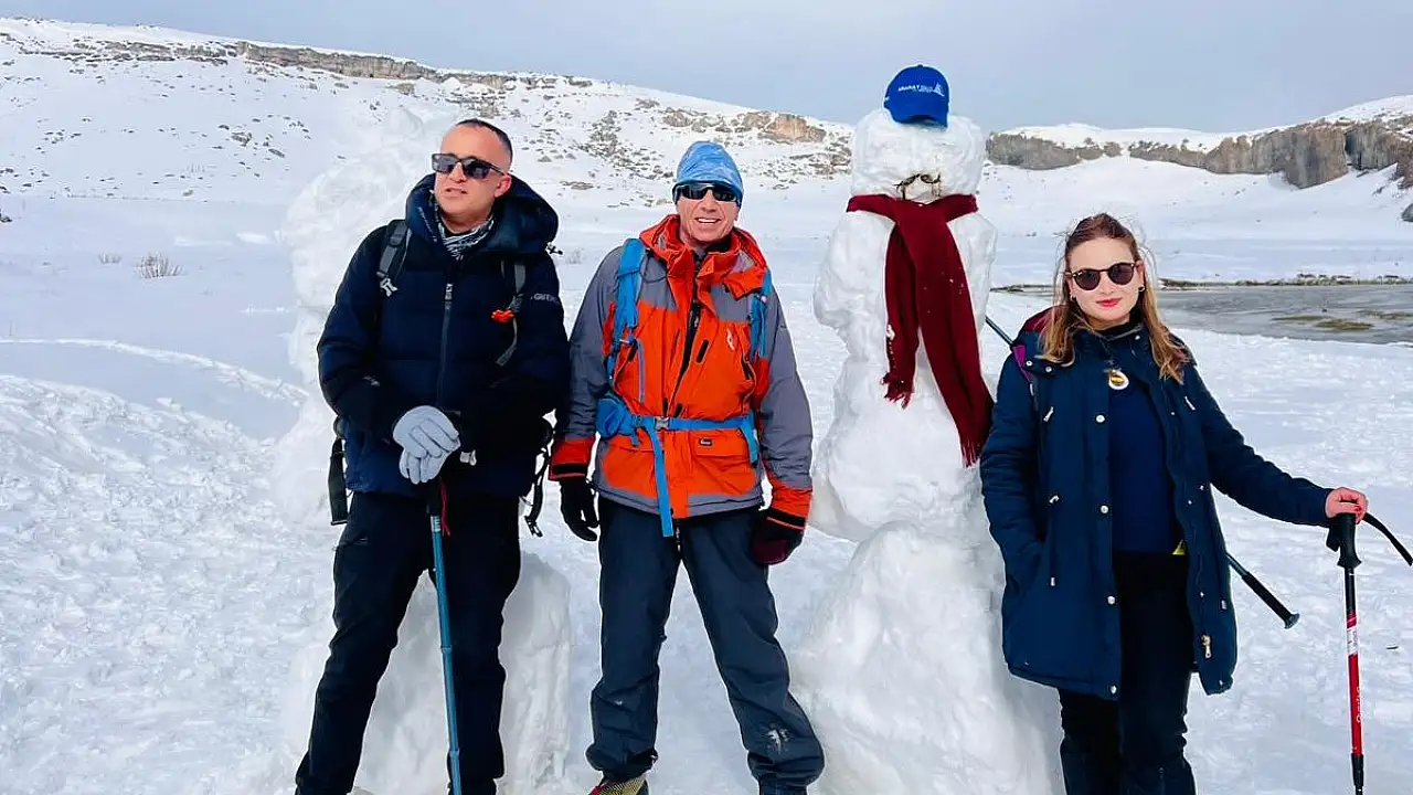 Doğubayazıt'ta doğaseverler karlı arazide yürüyüş yaptı. Kulüp üyeleri yürüyüş sonrası kardan adam yaparak fotoğraf çektirdi.