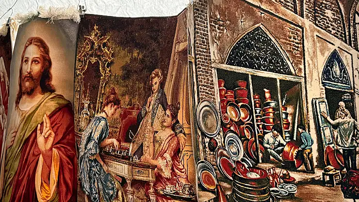 Ağrı şehir merkezinde kurulan Meydan Sebze Pazarı, sadece sebze ve meyve alışverişiyle değil, aynı zamanda kültürel dokulara ev sahipliği yapan eşyalarla da dikkat çekiyor. Pazarda yıllardır satışı süren otantik İran eşyaları, günümüzde de birçok vatandaşın ilgisini çekmeye devam ediyor. Özellikle duvara asılan İran halıları, geçmiş yıllarda olduğu gibi bugün de süs amaçlı tercih edilen geleneksel ürünler arasında yer alıyor. Halıların bazıları figürlü, bazıları ise düz ve sade olarak pazarda yer alıyor. Desenleri ve renkleriyle dikkat çeken bu ürünler, ev dekorasyonunda nostaljik bir hava yaratıyor.