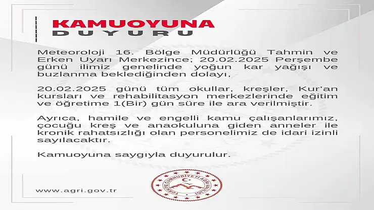 Ağrı Valiliği’nden yapılan açıklamaya göre, Meteoroloji 16. Bölge Müdürlüğü Tahmin ve Erken Uyarı Merkezi tarafından 20 Şubat 2025 Perşembe günü için yoğun kar yağışı ve buzlanma uyarısı yapıldı. Bu nedenle, il genelinde eğitim ve öğretime bir gün süreyle ara verildi.