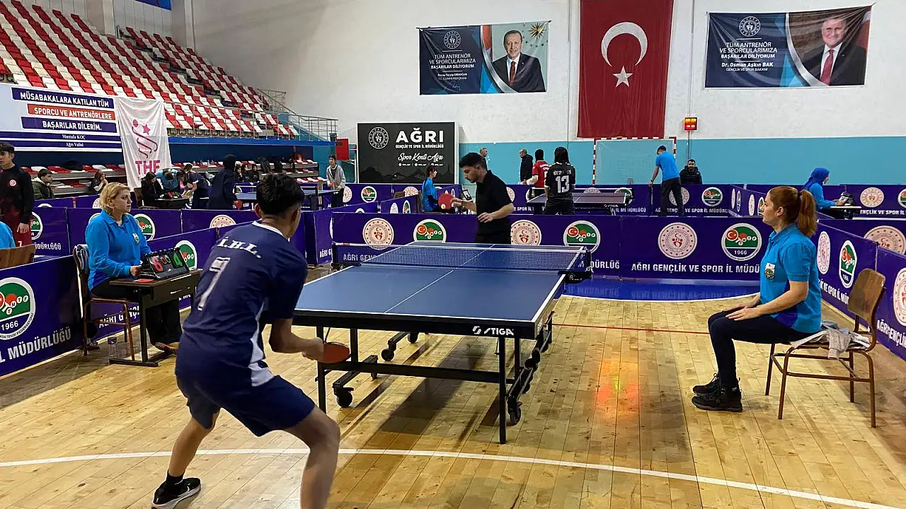 2025-2026 Eğitim Öğretim Yılı Okul Sporları Masa Tenisi Gençler (A) Kız/Erkek İl Birinciliği müsabakaları, 26 okul takımının katılımıyla Ağrı Merkez Spor Salonu'nda başladı genç sporcular il birinciliği için file önünde kıyasıya mücadele ediyor.