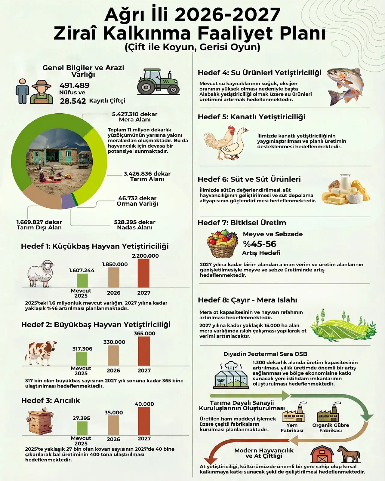 Ağrı’da tarım ve hayvancılık sektörünün planlı ve sürdürülebilir şekilde gelişimini hedefleyen “Ağrı İli Ziraî Kalkınma Faaliyet Planı (2026-2027)” yayımlanarak yürürlüğe girdi. Plan, Tarım ve Orman Bakanlığı tarafından hazırlanan 2024-2028 Stratejik Planı ile Ulusal Kırsal Kalkınma Stratejisi-IV (2024-2028) çerçevesinde hazırlandı.