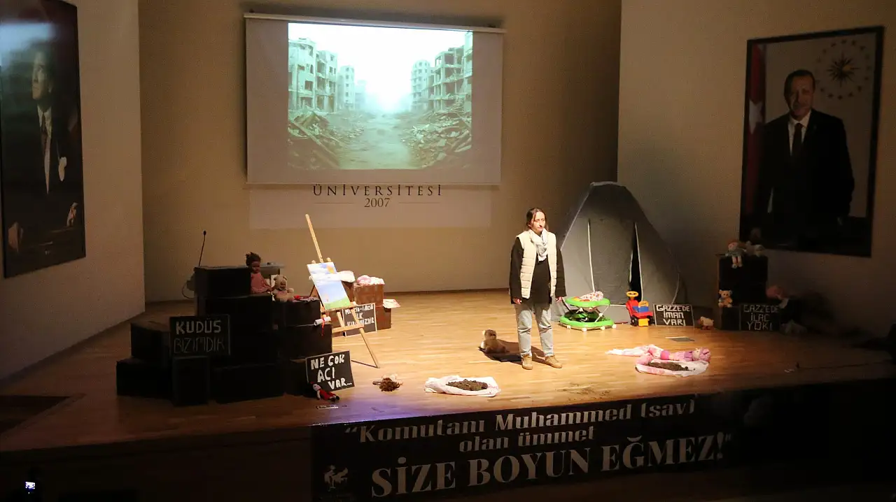 Ağrı İbrahim Çeçen Üniversitesi'nde öğrenciler, Gazze'deki insanlık dramına tiyatro ile dikkat çekti.