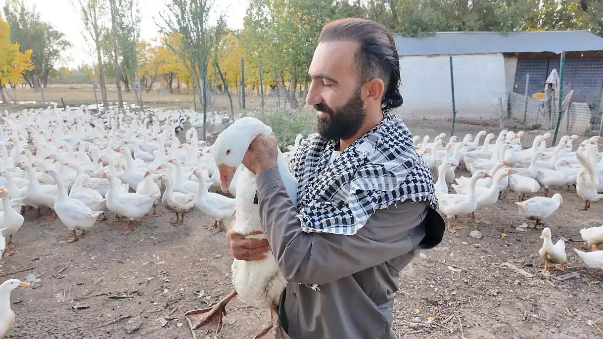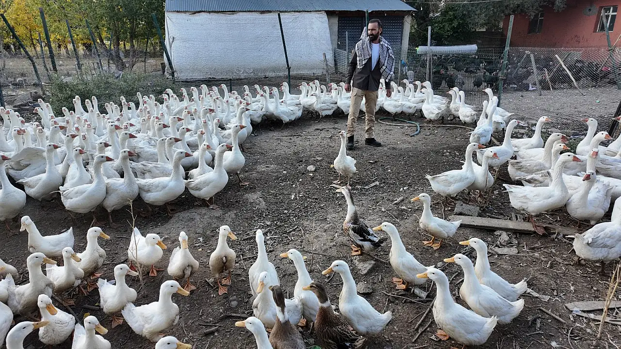 Ağrı'da yaklaşık 6 yıldır kanatlı hayvan üretimi yapan hüseyin kösedağ, ıslık çaldığında yüzlerce kaz ve ördeğin kendisine doğru koşmasıyla tebessüm ettiriyor.