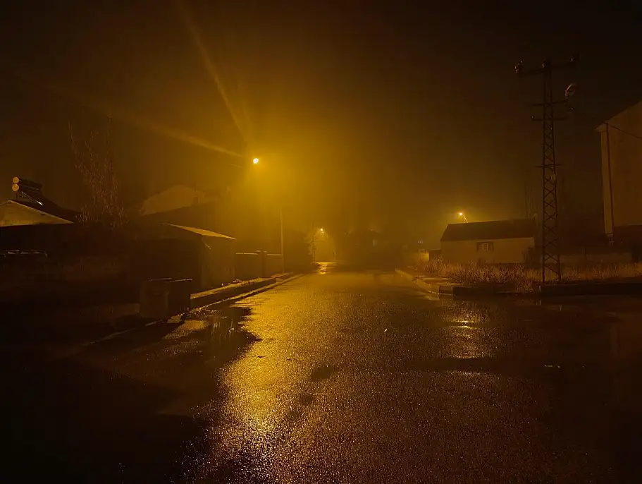 2 Aralık gecesi, Ağrı'da etkili olan yağmur sonrası sokaklar boşalırken, yer yer sis etkisini gösterdi.