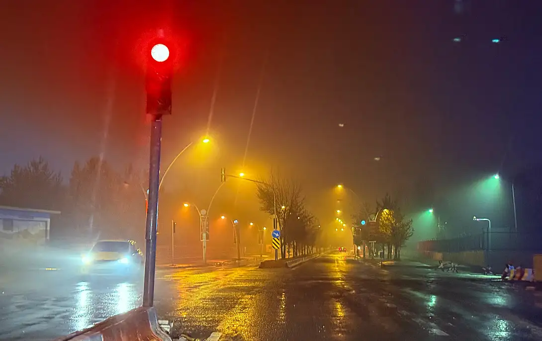 2 Aralık gecesi, Ağrı'da etkili olan yağmur sonrası sokaklar boşalırken, yer yer sis etkisini gösterdi.