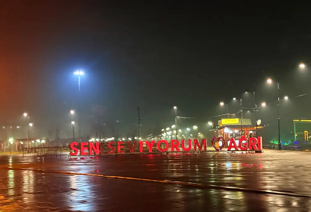 2 Aralık gecesi, Ağrı'da etkili olan yağmur sonrası sokaklar boşalırken, yer yer sis etkisini gösterdi.