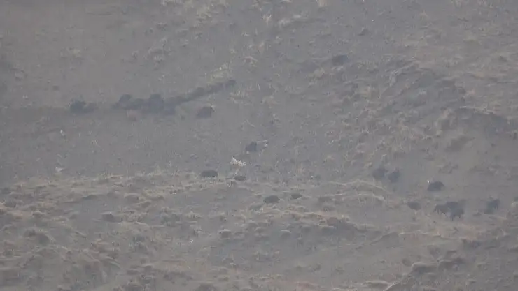 Ağrı'da aniden bastıran yağmur nedeniyle bulunduğu tepeden yukarıya doğru kaçmaya çalışan domuz sürüsü kameralara yansıdı.