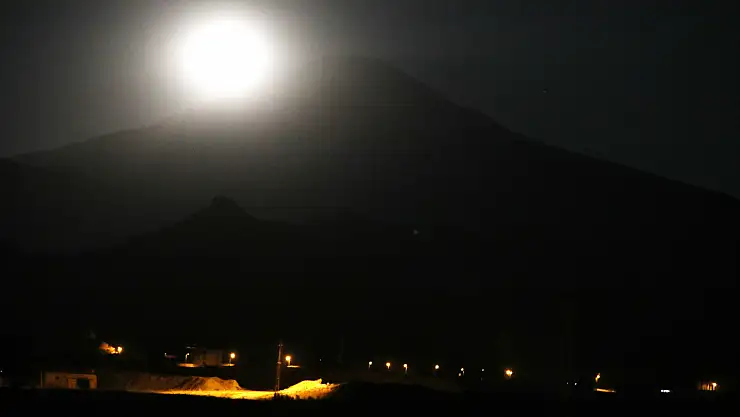 Muhteşem manzarası ile doğal bir tabloyu andıran Ağrı Dağı hemen yanında belirlenen 'Süper Ay' ile kartpostallık görüntüler oluşturdu.