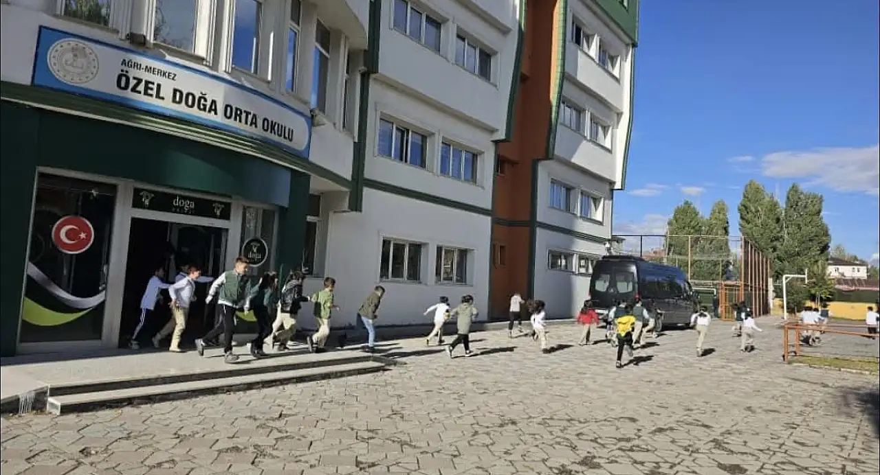 Ağrı Doğa Koleji'nde afet farkındalık eğitimi uygulamalı olarak yapıldı. Öğrenciler deprem ve yangın anında nasıl hareket edeceklerini öğrendi.