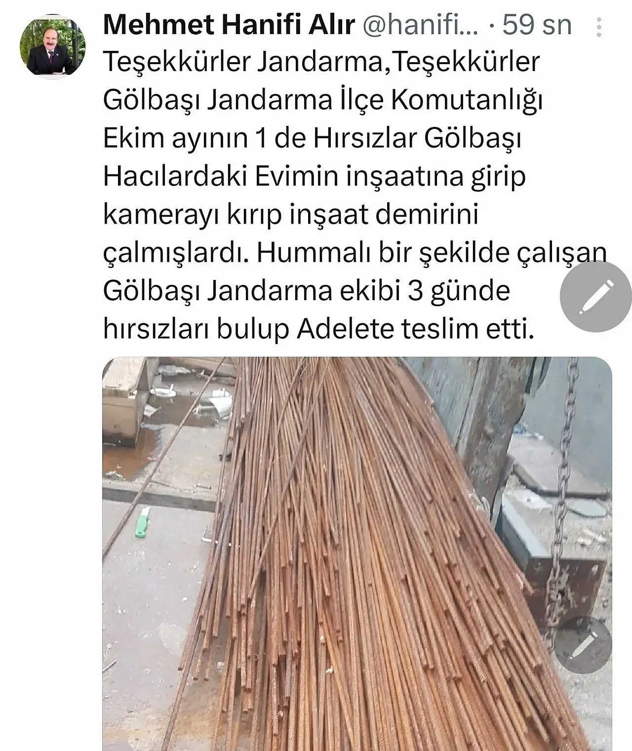 Olayın ardından açıklamada bulunan Mehmet Hanifi Alır, “Teşekkürler Jandarma, teşekkürler Gölbaşı Jandarma İlçe Komutanlığı. Hırsızlar evimin inşaatına girip kamerayı kırarak demirleri çalmışlardı. Hummalı bir şekilde çalışan jandarma ekibi 3 gün içinde hırsızları bulup adalete teslim etti,” ifadelerini kullandı.