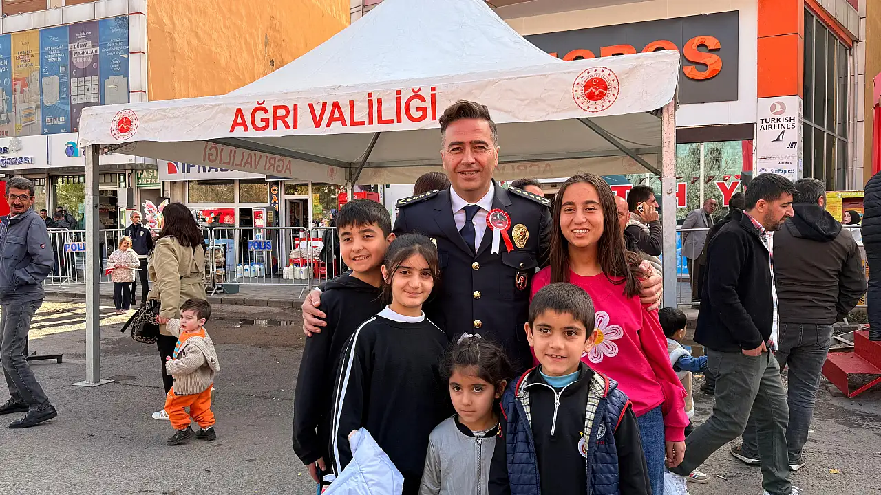 Ağrı'da 29 Ekim Cumhuriyet Bayramı kutlamalarından sonra vatandaşlar ve çocuklar, yeni atanan Emniyet Müdürü Göksel Önder'e büyük ilgi gösterdi.