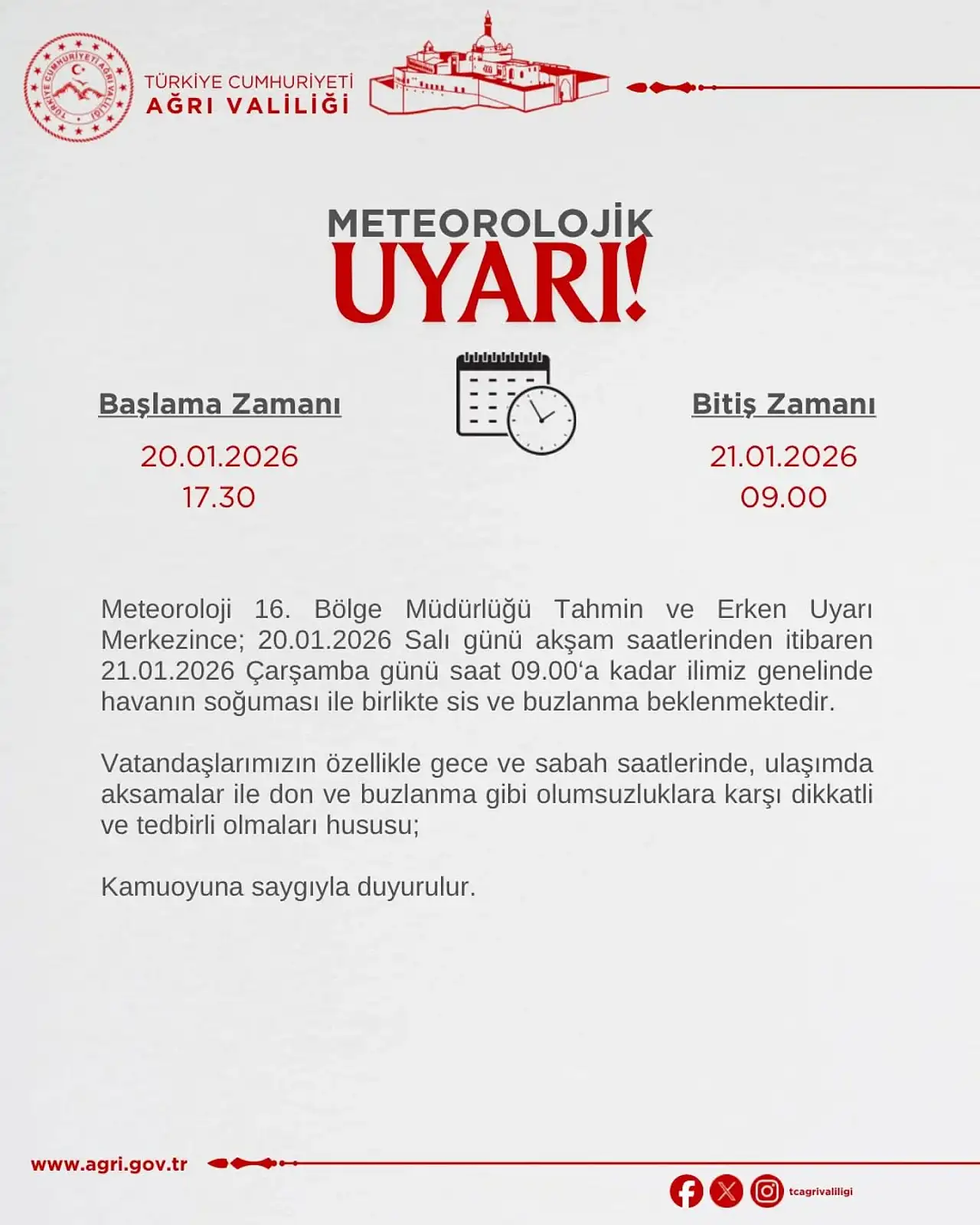 Ağrı Valiliği, Meteoroloji verilerine dayanarak il genelini kapsayan bir meteorolojik uyarı yayımladı. Yapılan açıklamada, 20 Ocak 2026 Salı günü akşam saatlerinden itibaren hava sıcaklıklarında düşüşle birlikte sis ve buzlanma beklendiği bildirildi. Valilik tarafından paylaşılan bilgilere göre, Meteoroloji 16. Bölge Müdürlüğü Tahmin ve Erken Uyarı Merkezi’nin değerlendirmeleri doğrultusunda, olumsuz hava koşullarının 20 Ocak 2026 Salı günü saat 17.30’dan başlayarak 21 Ocak 2026 Çarşamba günü saat 09.00’a kadar etkili olması öngörülüyor.