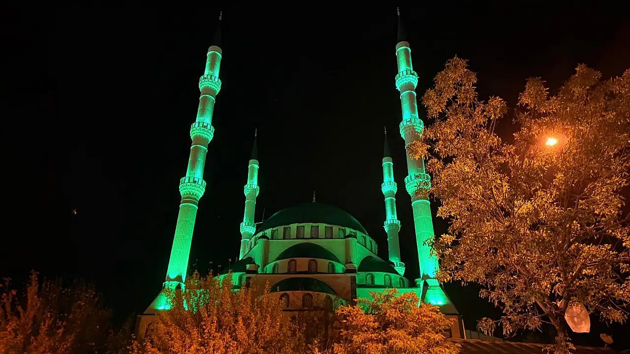 Ağrı Merkez Camii , geceyi aydınlatan yeşil ışıklarıyla dikkat çekiyor