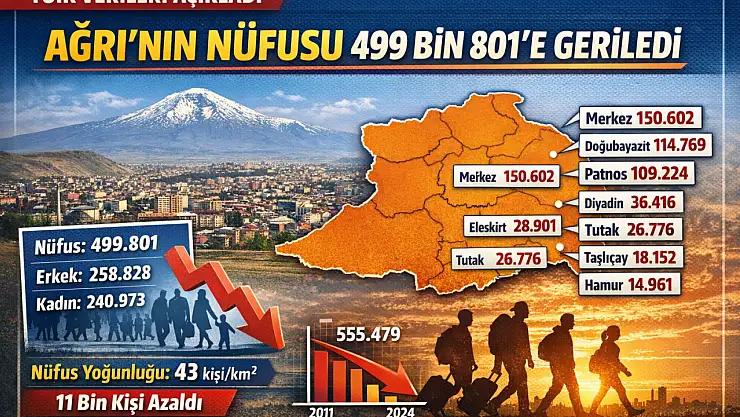 TÜİK'in ADNKS verilerine göre Ağrı'nın nüfusu 2024 yılında 499 bin 801'e geriledi. Merkez ilçe 150 binin üzerindeki nüfusuyla ilk sırada yer alırken, Hamur en az nüfusa sahip ilçe oldu.