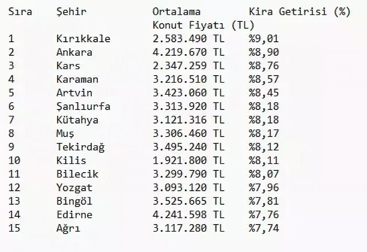 Endeksa’nın Ekim 2025 raporuna göre, kira getirisi en yüksek şehirler arasında Kırıkkale (%9,01), Ankara (%8,90) ve Kars (%8,76) ilk üç sırayı aldı. Ancak asıl sürpriz, İstanbul’un liste dışı kalması ve Ağrı’nın ilk 15’e girmesi oldu. Bu tablo, yatırımcıların artık sadece metropollere değil, Anadolu’nun gelişen şehirlerine yöneldiğini gösteriyor.