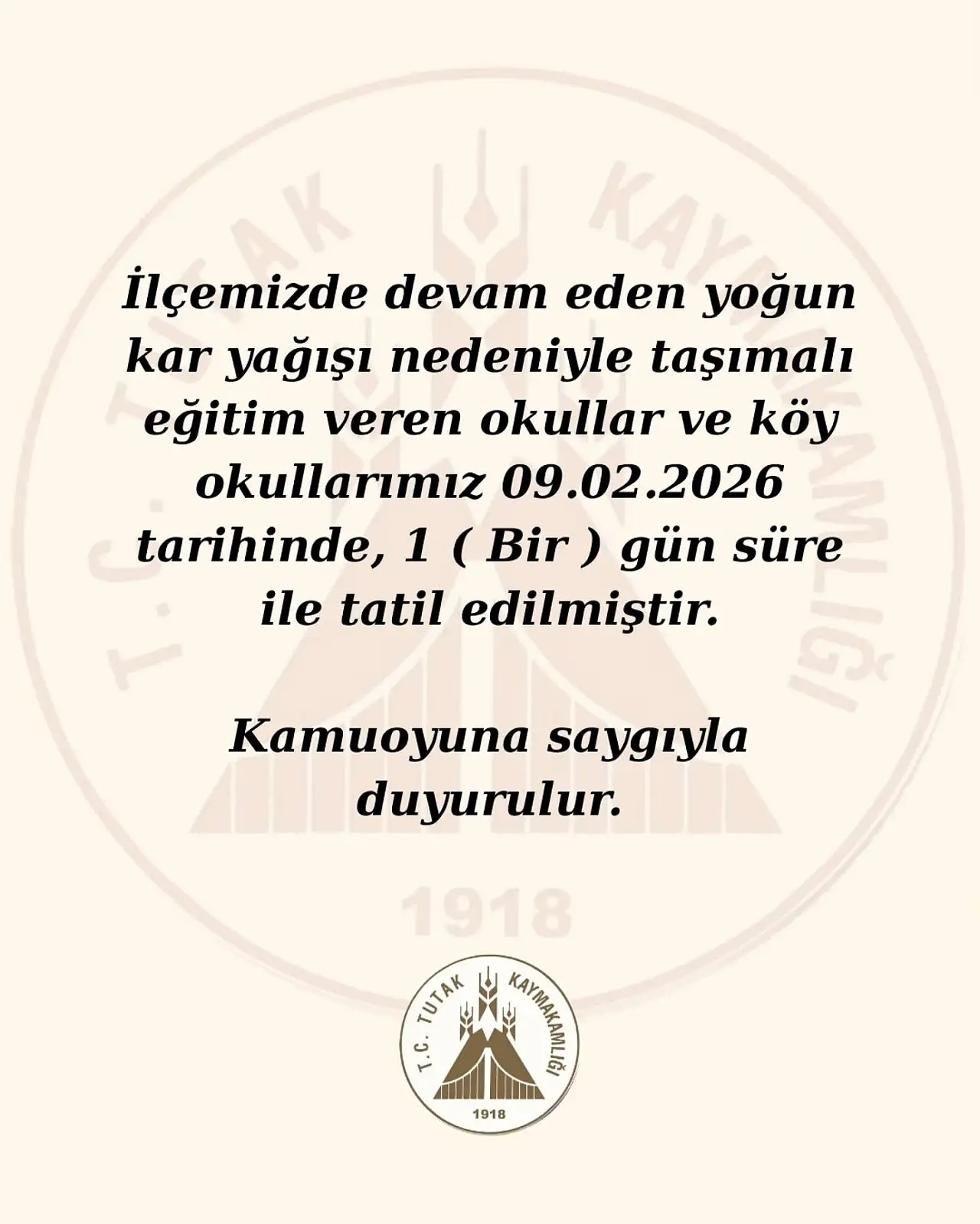 Tutak Kaymakamlığı tarafından yapılan açıklamada, ilçede devam eden olumsuz hava koşulları ve yoğun kar yağışı sebebiyle taşımalı eğitim kapsamında bulunan okullar ile köy okullarında eğitime 09 Şubat 2026 Pazartesi günü 1 gün süreyle ara verildiği bildirildi.