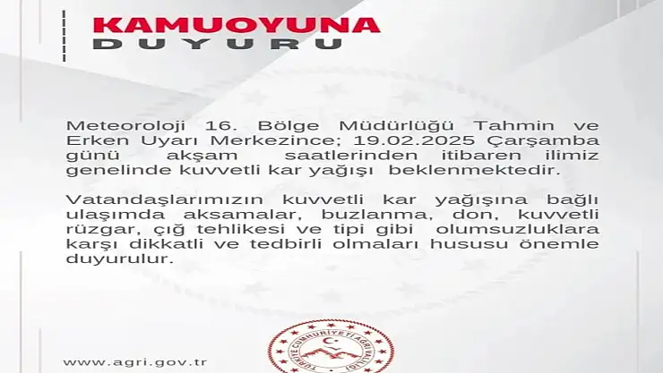 Meteoroloji 16. Bölge Müdürlüğü Tahmin ve Erken Uyarı Merkezi, 19 Şubat 2025 Çarşamba günü akşam saatlerinden itibaren Ağrı genelinde kuvvetli kar yağışının etkili olacağını duyurdu.