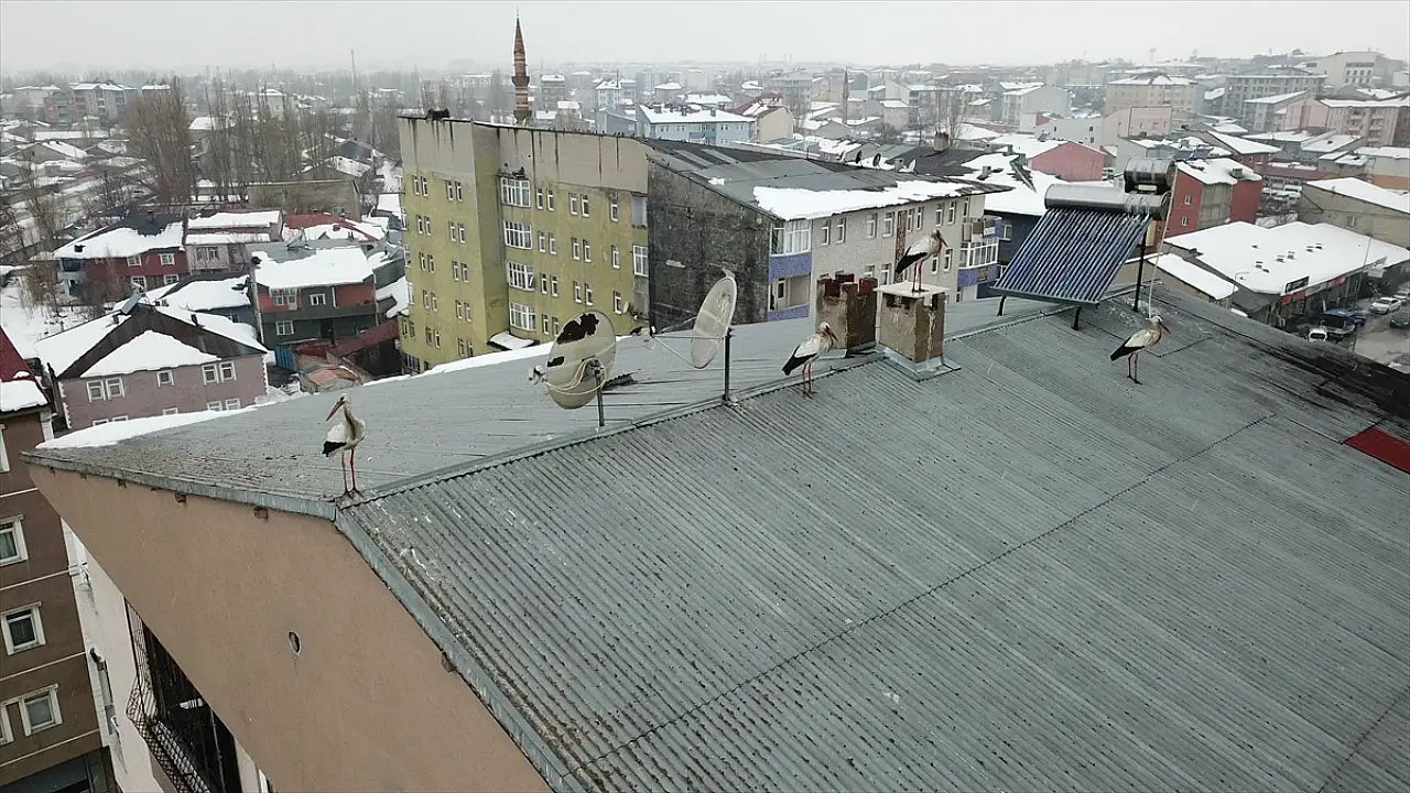 Karla kaplı ve soğuk havanın etkili olduğu Ağrı'da, baharın habercisi leyleklerin kış ortasında görülmesi vatandaşlarda şaşkınlık oluşturdu.