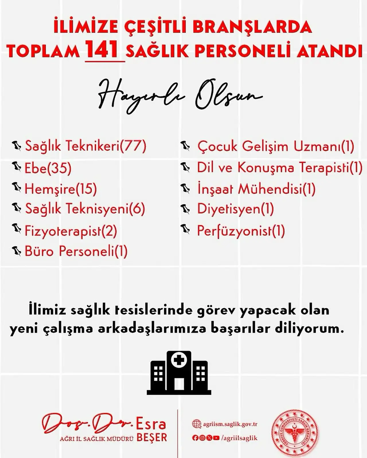 Ağrı'ya sağlık takviyesi: Farklı branşlarda 141 atama