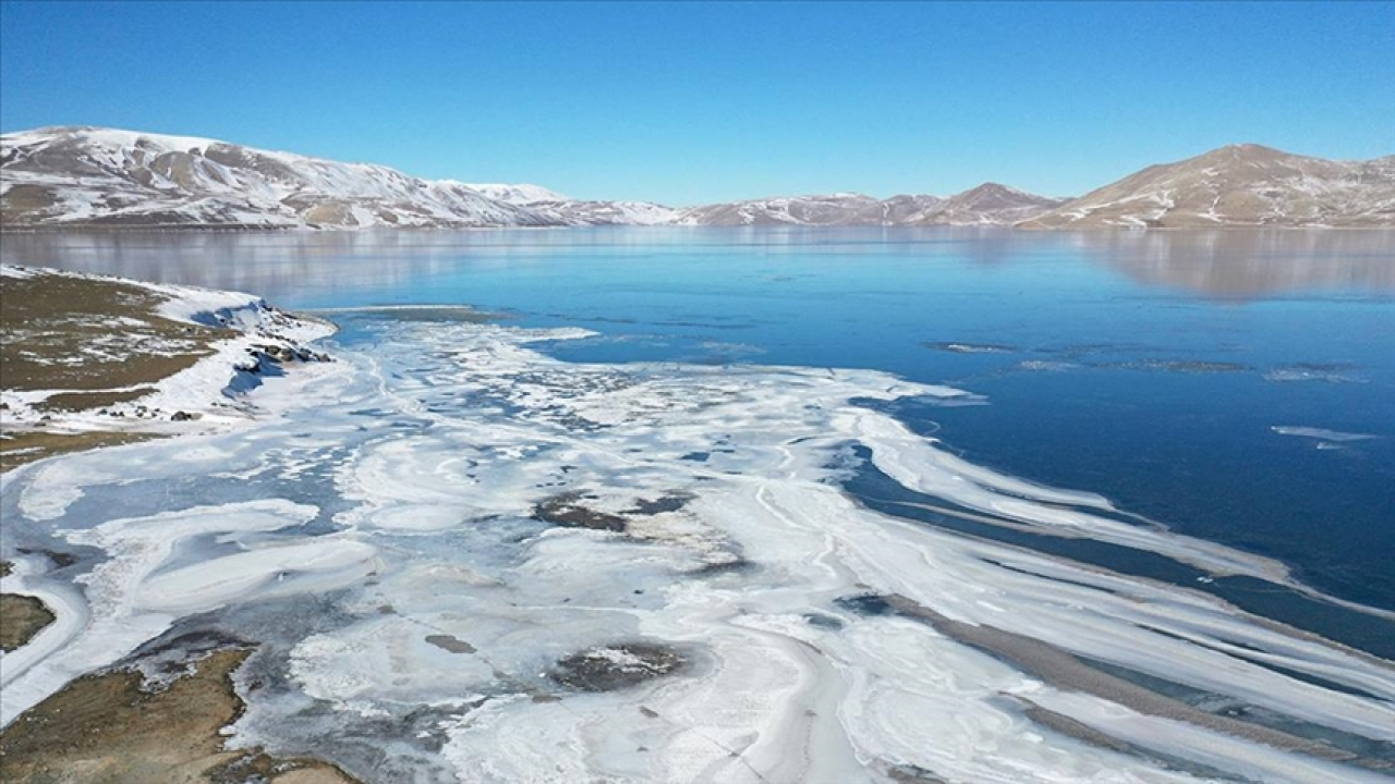 Aras Dağları’nın kuzeyinde, Taşlıçay ilçesinde 2 bin 241 rakımda yer alan ve volkanik set gölü olma özelliği taşıyan Balık Gölü, dondurucu soğukların etkisiyle buzla kaplanan yüzeyiyle görsel bir şölen sunuyor.