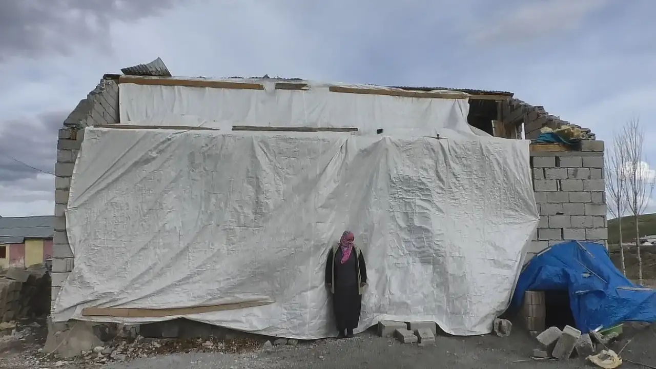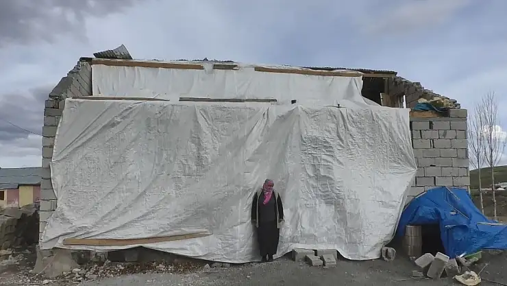 Ağrı'da 3 gün önce etkili olan şiddetli fırtına nedeniyle evinin çatısı kullanılamaz hale gelen ve evinin etrafına branda çadırı ile saran yalnız başına yaşayan Vayide Demirel adlı yaşlı kadın kendisine uzatılacak yardım elini bekliyor.