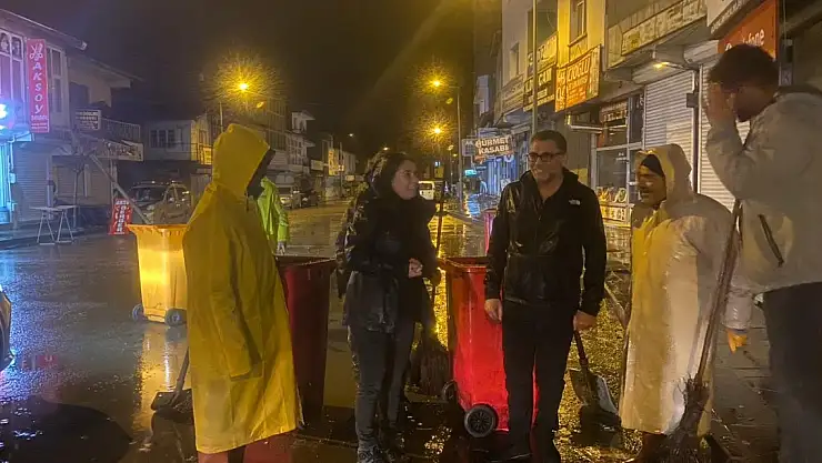 Islanmasına rağmen temizlik ekibini yalnız bırakmayan Başkan Aras, sabah kadar süren temizlik çalışmalarını koordine etti.
