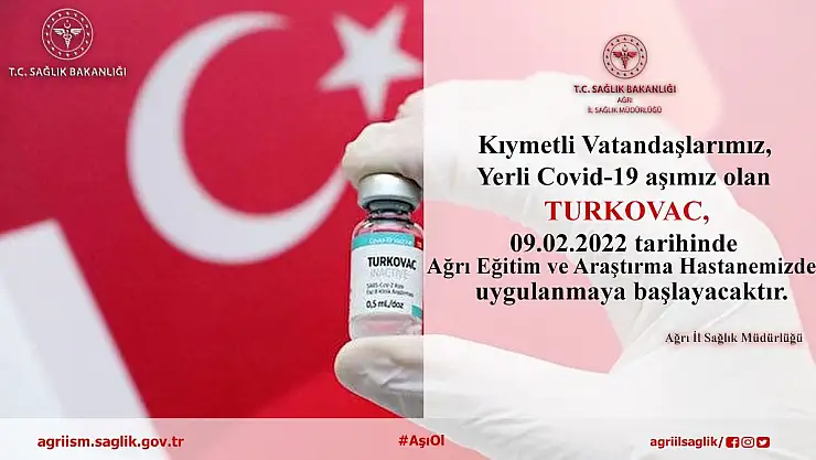 Ağrı İl Sağlık Müdürlüğü tarafından yapılan açıklamada: “Kıymetli vatandaşlarımız, Yerli Covid-19 aşımız olan TURKOVAC, 09.02.2022 tarihinde Ağrı Eğitim ve Araştırma Hastanemizde uygulanmaya başlayacaktır.” Denildi.