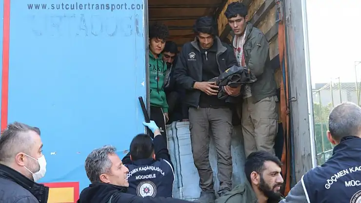 Tır dorsesinde küçük bir alana gizlenen 64 kaçak göçmen yakalanarak araçtan indirildiler.
