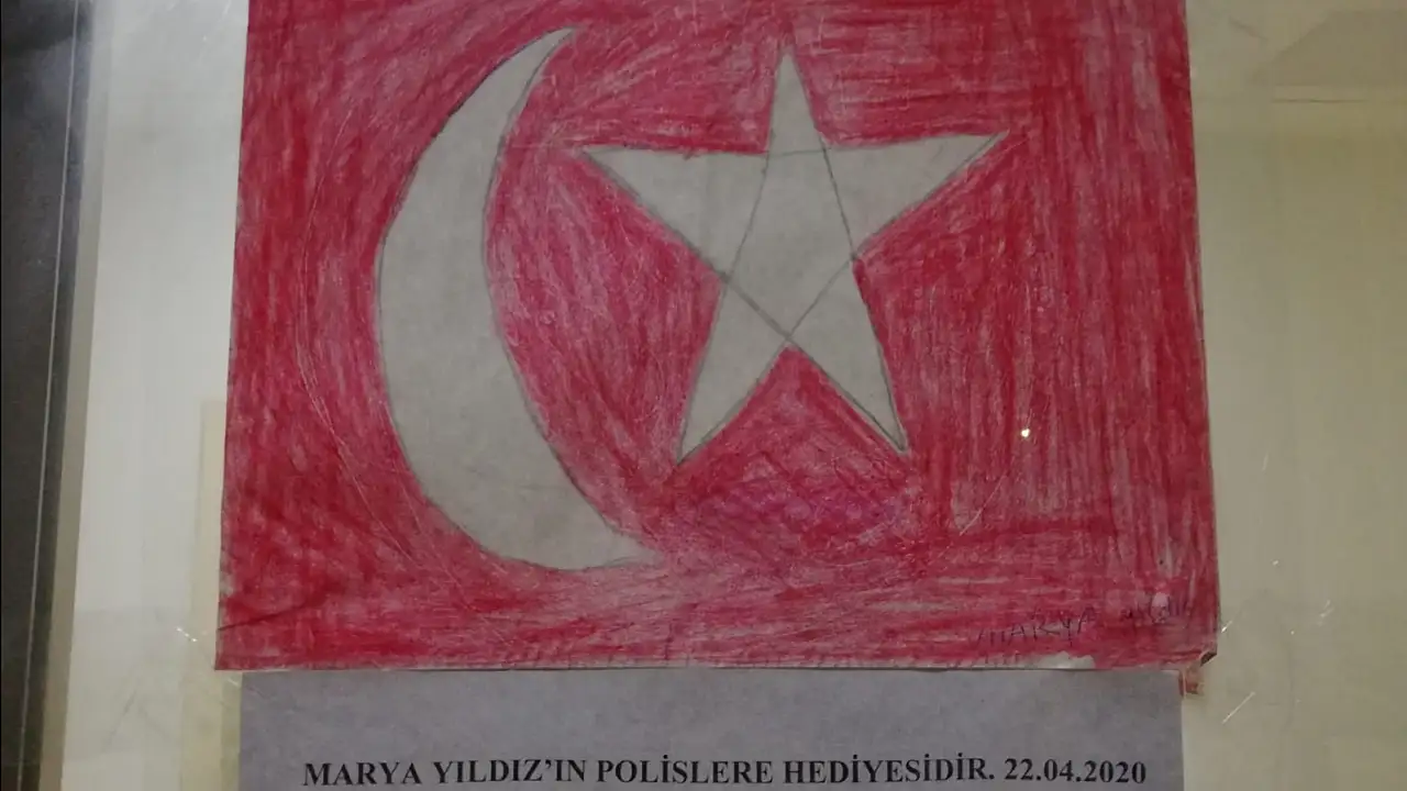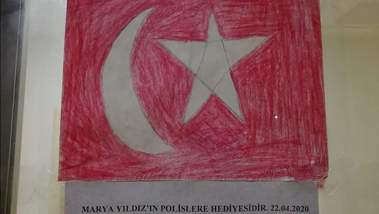 Ardından İlçe Emniyet Müdürlüğü’ne dönen Polisler, Küçük Marya’nın çizdiği Türk Bayrağı’nı İlçe Emniyet Müdürlüğü’nün girişine hatıra olarak astı.
