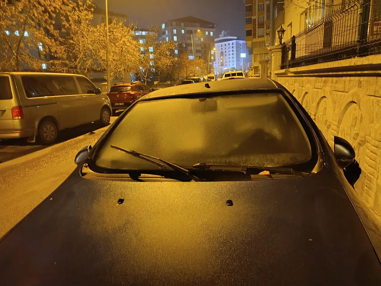 Ağrı'da kasım ayının son haftasına yaklaşılmasına rağmen henüz kar yağışı görülmezken, gece ayazı araçların üzerinde ince buz tabakaları oluşturdu.