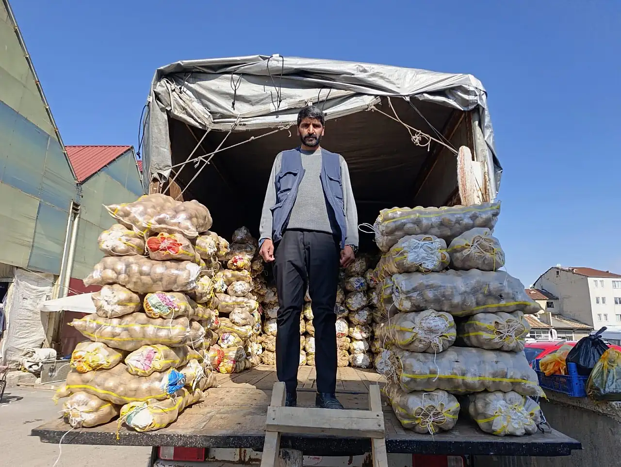Ağrı'da kış hazırlıkları başladı, patates satışları arttı. Vatandaşlar çuvallarla Ahlat patatesi alıyor.