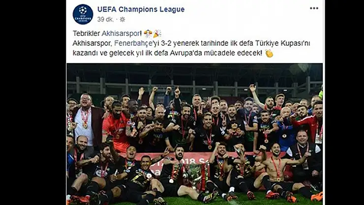 UEFA Şampiyonlar Ligi resmi sosyal medya hesabı, Ziraat Türkiye Kupası’nı müzesine götüren Akhisarspor için tebrik mesajı yayınladı. Türkçe bir şekilde tebrik mesajı yayınlayan UEFA şu ifadelere yer verdi;