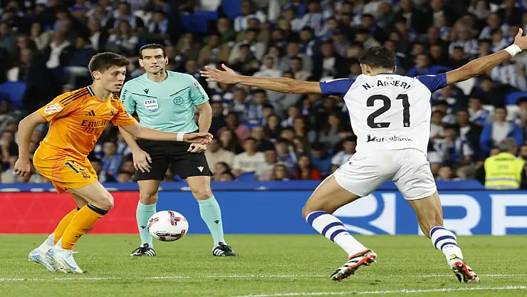 İspanya LaLiga'nın 5. haftasında Real Madrid, Real Sociedad'a konuk oldu. Milli futbolcu Arda Güler, sahaya 11'de çıkarken, Modric ve Valverde'nin önünde 10 numara pozisyonunda yer aldı. Karşılıklı ataklarla geçen ilk yarıda gol sesi çıkmazken, ev sahibinin iki topu direkten döndü. Sociedad, karşılaşmanın 2. yarısına da etkili başladı ve ilk dakikada girdiği pozisyon da yeniden direğe takıldı.
