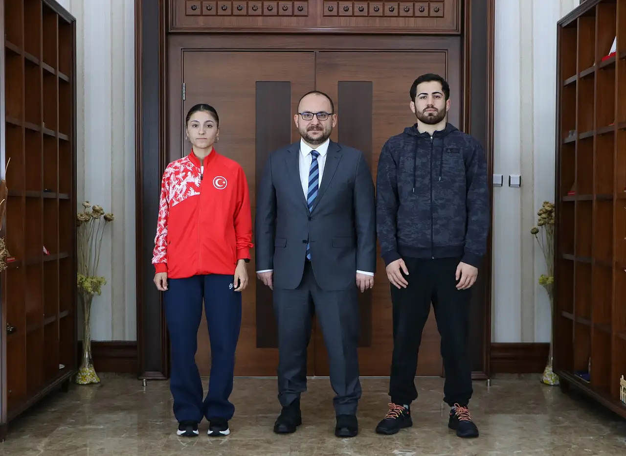 Muş Alparslan Üniversitesi Spor Bilimleri Fakültesi öğrencileri Ömer Can Doğan ve Elif Akçiçek, elde ettikleri ulusal ve uluslararası başarıların ardından Rektör Prof. Dr. Mustafa Alican'ı ziyaret etti.