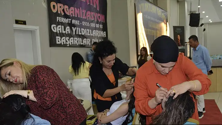Fuar Kongre Merkezinde düzenlenen programa katılan berber, kuaför ve güzellik uzmanları, saç kesimi, renklendirme, topuz, türban, gelinlik, kalıcı makyaj ve cilt bakımı yaptı.