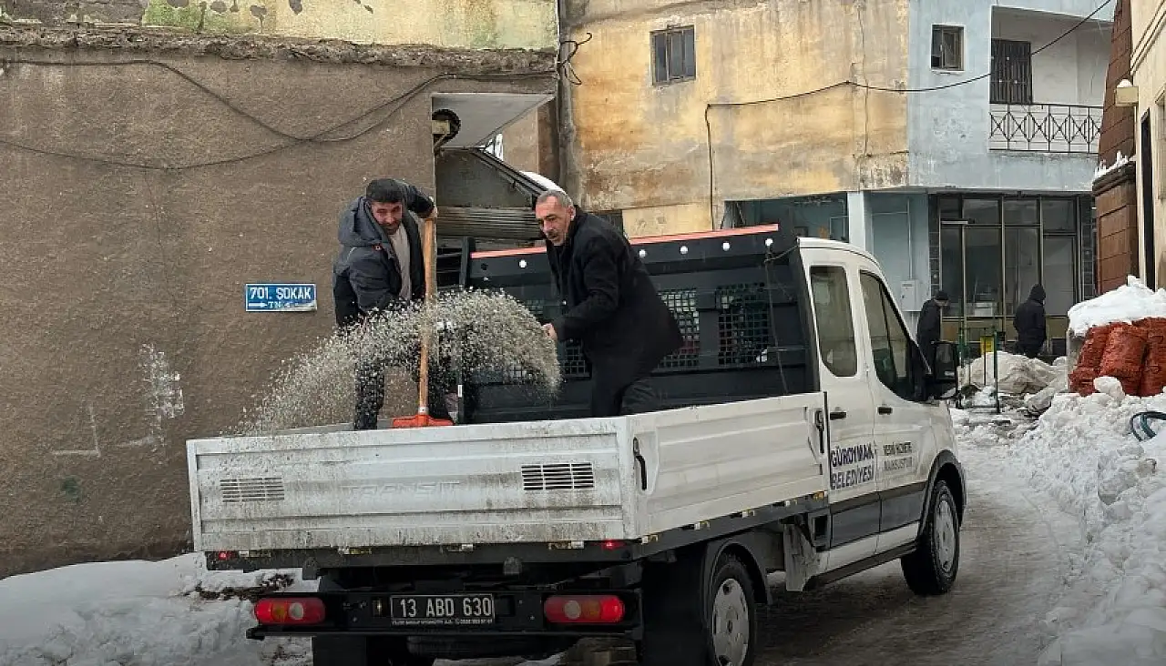Güroymak Belediyesi, olumsuz hava koşullarına bağlı buzlanma riskine karşı ilçe genelinde kaldırımlar ve yaya yollarında tuzlama çalışmalarını aralıksız sürdürüyor.