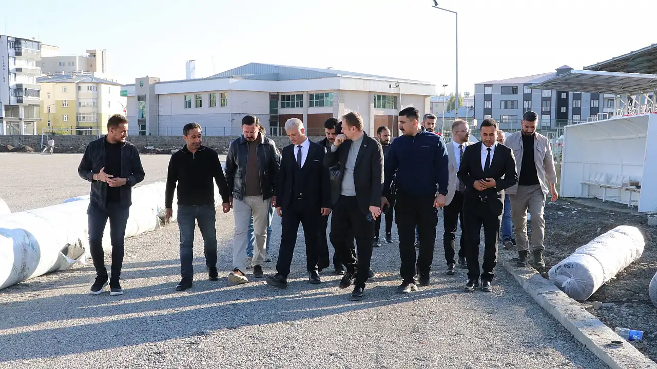 Yusuf Kılıç ve Kaymakam Ömer Övünç Koşansu, Bulanık'ta yapımı süren sentetik çim yüzeyli futbol sahası, 250 kişilik çelik tribün ve soyunma odaları çalışmalarını inceledi.