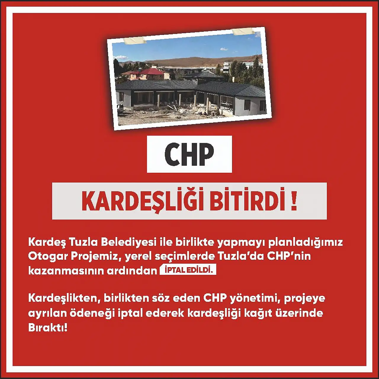 “Kardeş Tuzla Belediyemiz ile birlikte Eleşkirt’te kazandırmayı planladığımız Otogar Projesi, Tuzla’da yerel seçimlerin ardından göreve gelen CHP’li yönetim tarafından tek taraflı olarak iptal edilmiştir. Kardeşlik ve dayanışma söylemlerini sıkça dile getiren CHP yönetimi, bu kararıyla hem kardeşlik hukukuna hem de yerel yönetimler arasındaki iş birliği kültürüne zarar vermiştir.