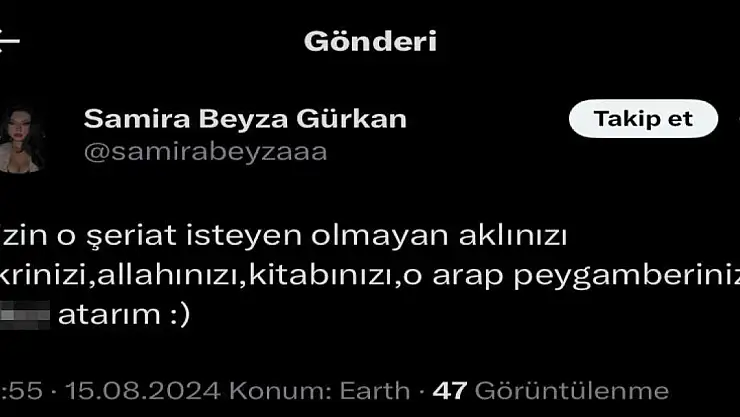 Edinilen bilgiye göre, sosyal medya hesapları üzerinden "sizin o şeriat isteyen olmayan aklınızı, fikrinizi, allahınızı, kitabınızı, o arap peygamberinizi s.... atarım:)" şeklinde ağza alınmayacak hakaretler eden ve uyuşturucu madde kullanımını özendirecek paylaşımlar yapan Samira Beyza Gürkan'ın (22) adresi Sivas Emniyet Müdürlüğü Siber Suçlarla Mücadele Şube Müdürlüğü ekipleri tarafından yapılan çalışmayla tespit edildi. Narkotik ve Güvenlik Şube Müdürlükleri ekipleri, 18 Ağustos tarihinde genç kadını yakalayarak gözaltına aldı. Yapılan işlemlerin ardından şüpheli, "uyuşturucu madde kullanımını özendirme, halkın bir kesiminin benimsediği dini değerleri alenen aşağılama" suçlarından adli makamlara sevk edildi. Samira Beyza Gürkan, çıkarıldığı mahkemece tutuklanarak cezaevine gönderildi.