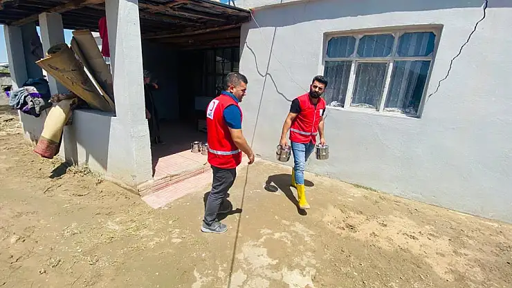 Ağrı'nın Doğubayazıt ilçesinde yaşanan sel felaketinden etkilenen vatandaşlara, Kızılay tarafından sıcak yemek ve çeşitli yardım malzemeleri ulaştırılıyor