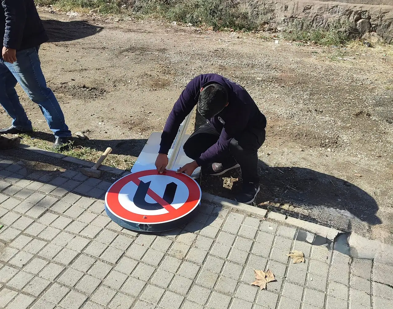 Doğubayazıt'ta zabıta ekipleri trafik levhalarını yeniliyor