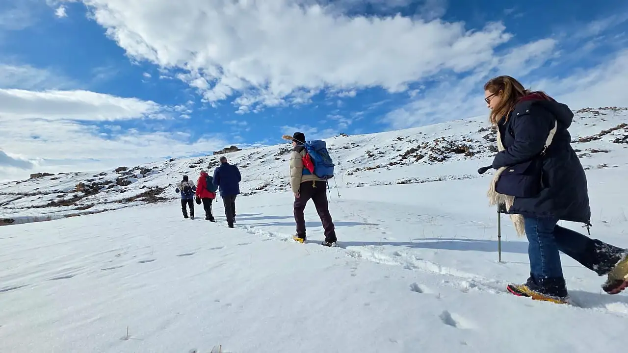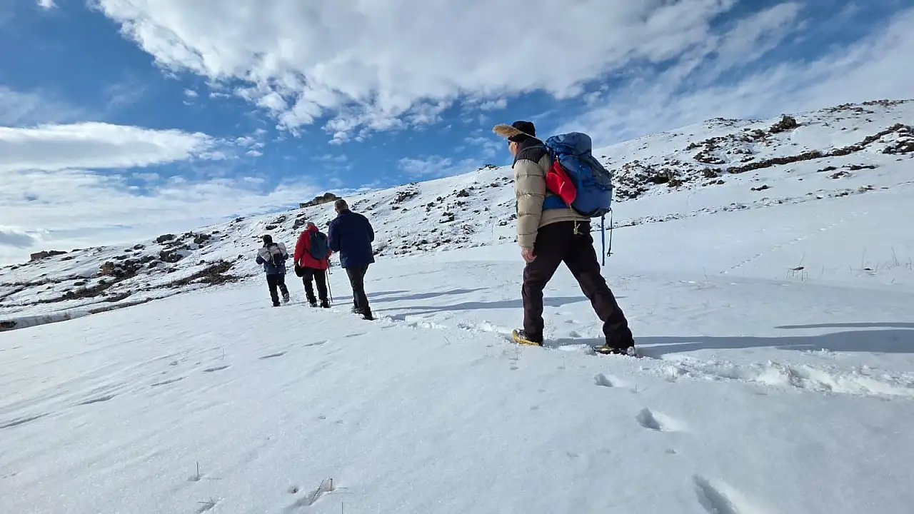 Doğubayazıtlı doğaseverler, kış şartlarına rağmen doğa yürüyüşlerini sürdürüyor.