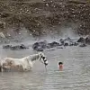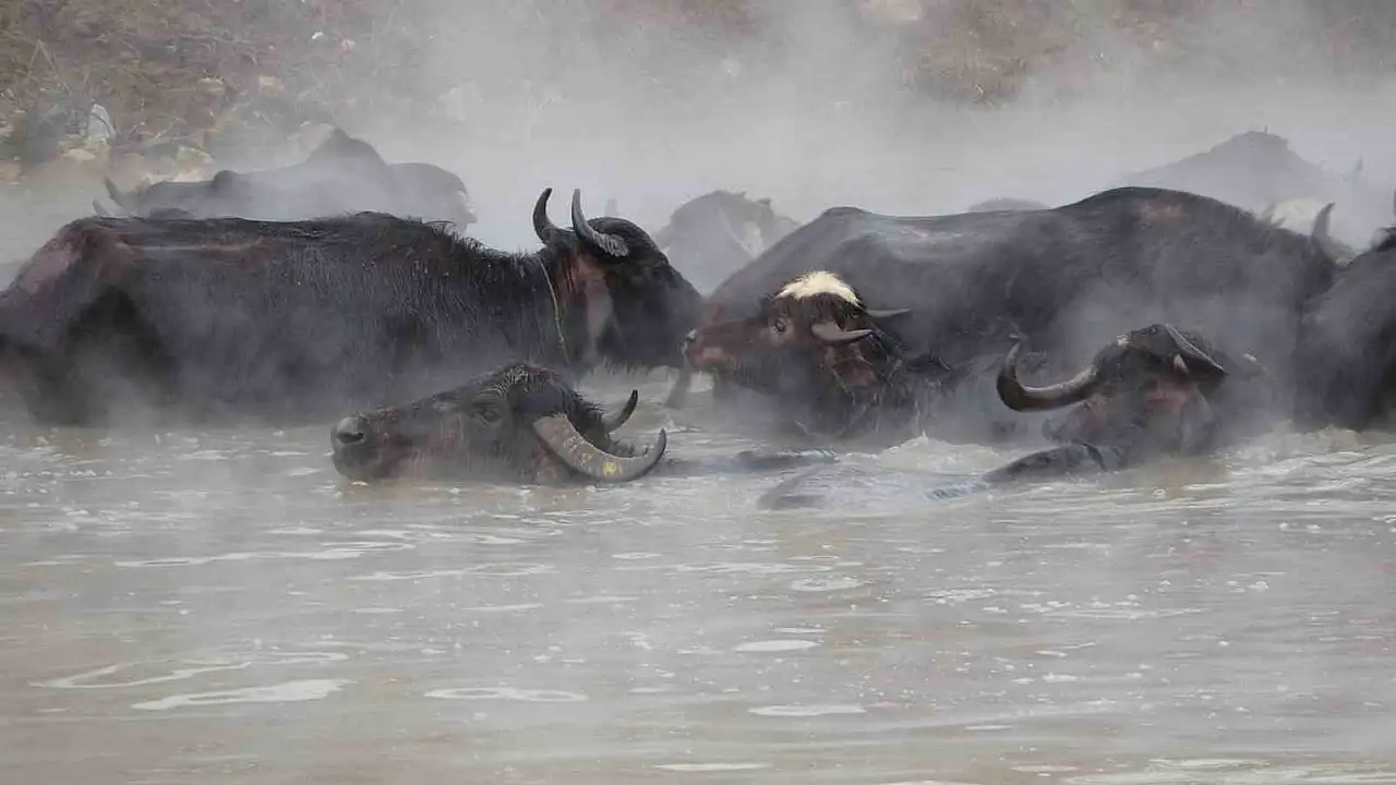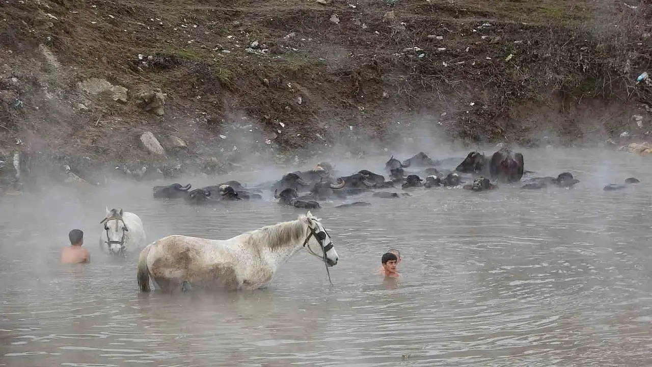 Bitlis'in Güroymak ilçesindeki Budaklı Kaplıcası, bu kez turistlerin değil manda ve atların sıcak su banyosuna sahne oldu.